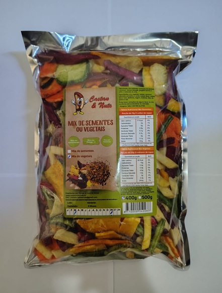 O Mix de Vegetais é um snack crocante e saudável, composto por legumes desidratados e assados, como batata, cenoura, rabanete vermelho e verde, batata-doce, batata-doce roxa, abóbora e vagem. É uma alternativa nutritiva aos salgadinhos industrializados, rico em fibras, sem glúten, sem corantes e frequentemente vegano. Utiliza óleo de palma para textura, mantendo os nutrientes.